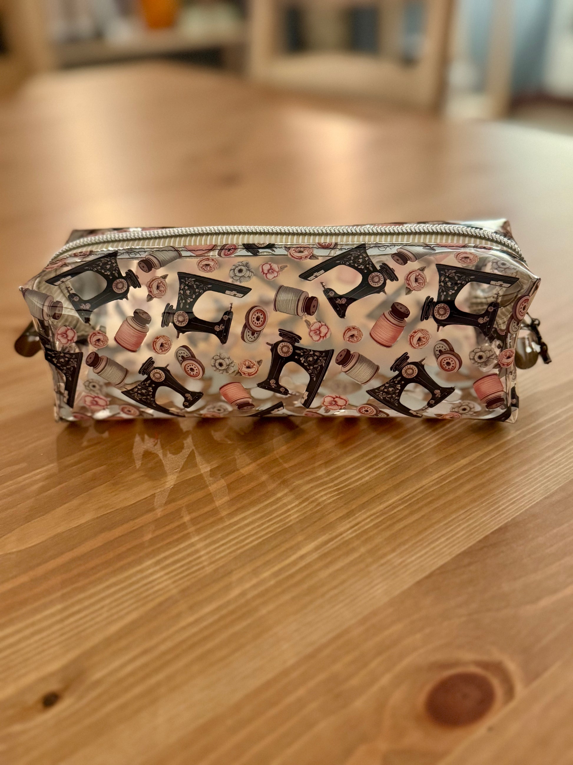 An adorable handmade vinyl notions bag with decorative zipper charm!