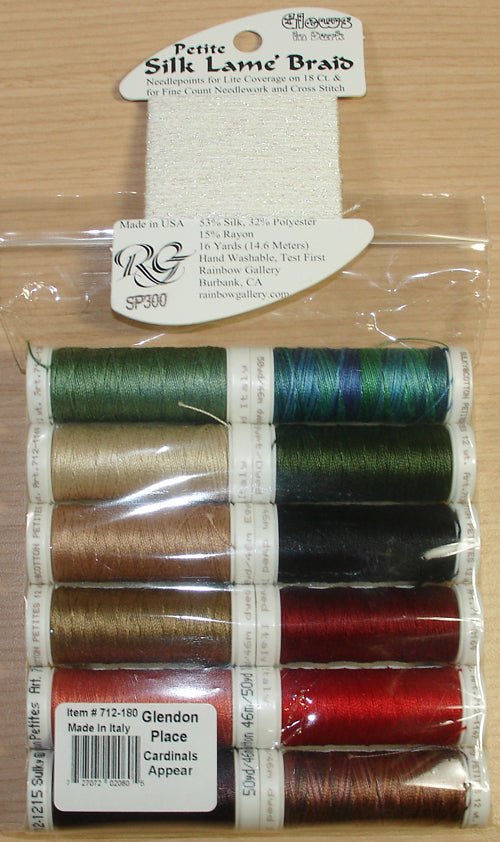 Pack contains 12 spools of Sulky 12 Wt. Cotton Petites thread and 1 color Rainbow Gallery Silk Lame’ Braid.