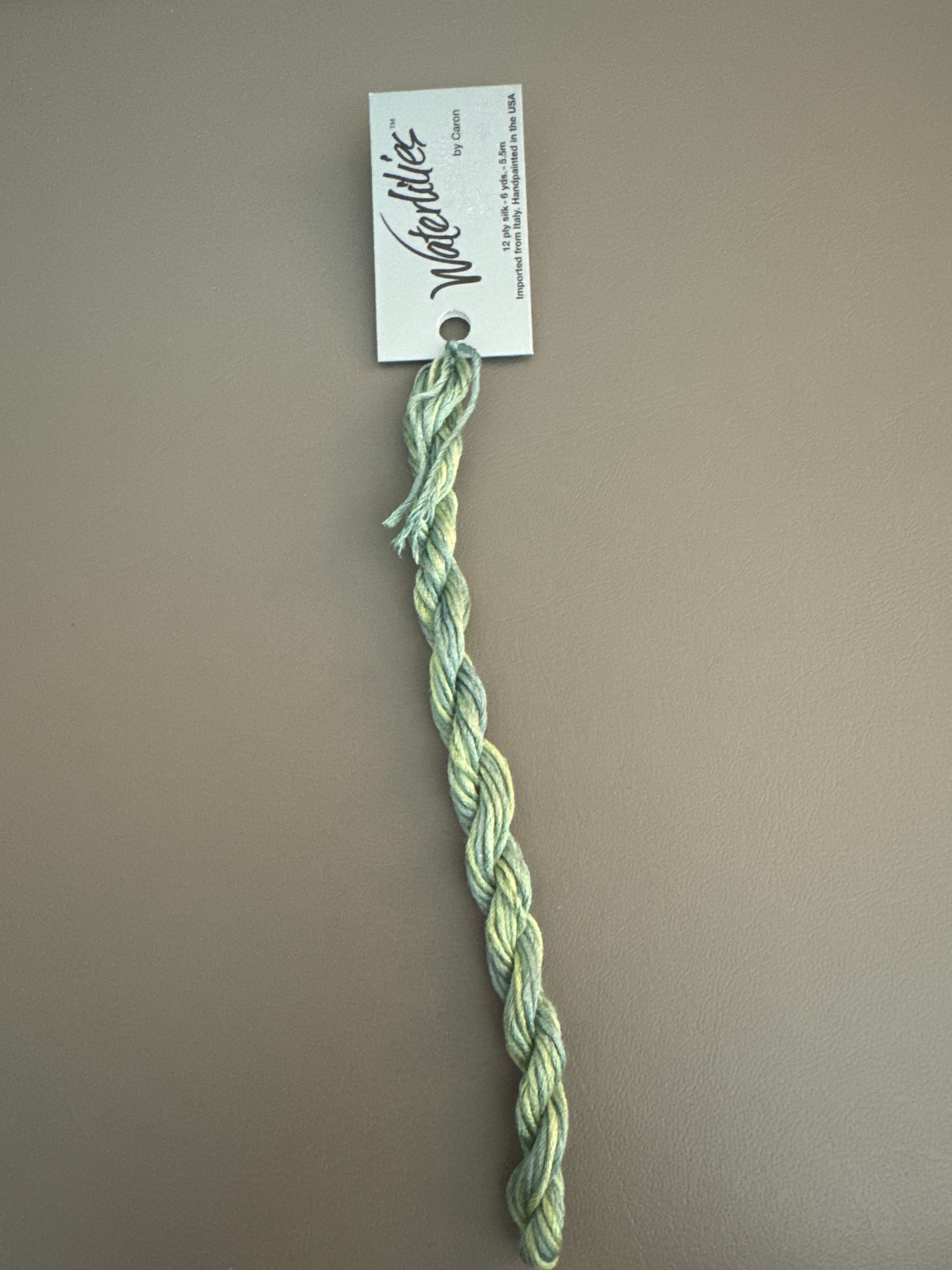 Hand-dyed 12 ply spun silk. 6 yard skein. Easily divided, it fits beautifully on many fabric and canvas sizes. Four plies work well on 18 count canvas, two plies cover 18 count fabric for cross stitch. Also use two plies for cross stitch over two threads on 28 count fabric. Good for surface embellishment on quilts.