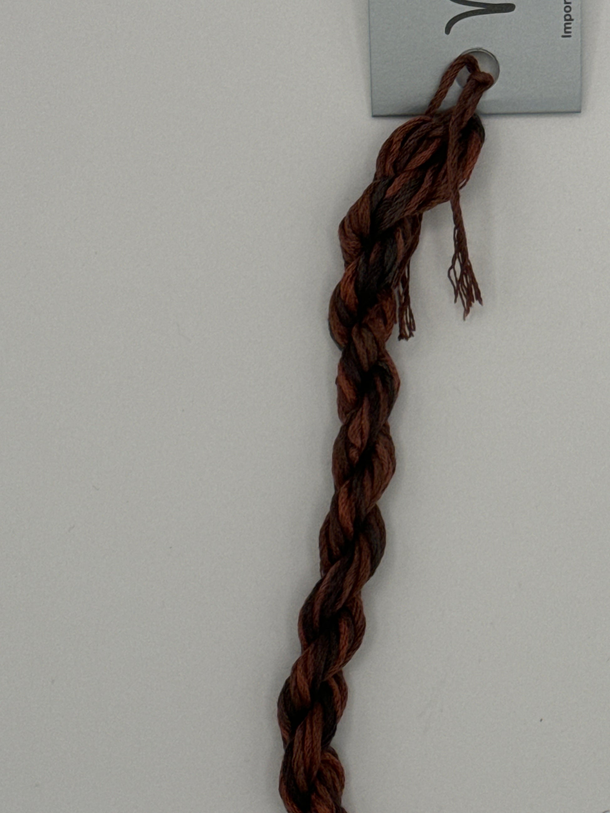 Hand-dyed 12 ply spun silk. 6 yard skein. Easily divided, it fits beautifully on many fabric and canvas sizes. Four plies work well on 18 count canvas, two plies cover 18 count fabric for cross stitch. Also use two plies for cross stitch over two threads on 28 count fabric. Good for surface embellishment on quilts.