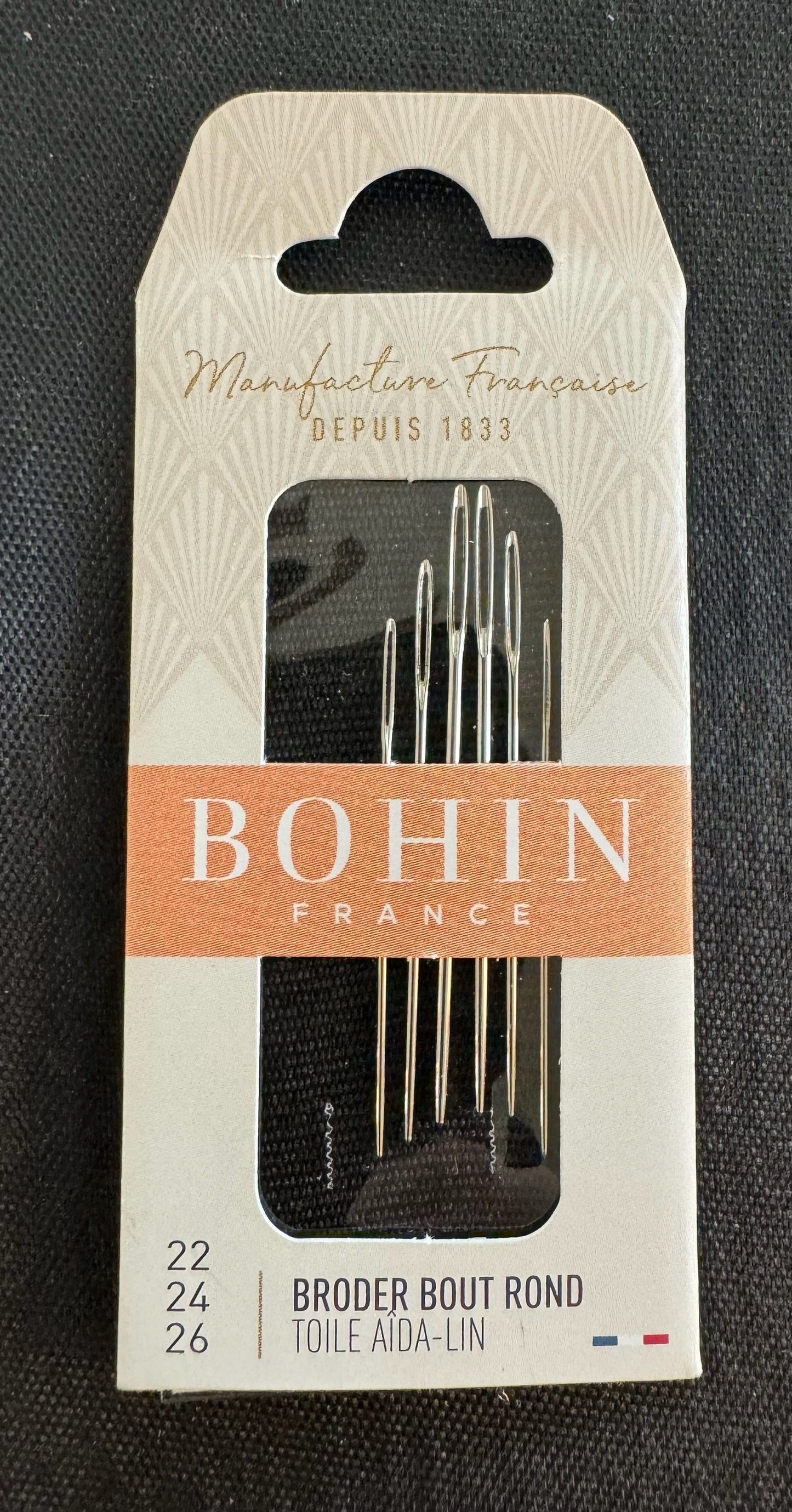 Bohin tapestry needles 2 each in sizes 22, 24, 26. Sold by the card; please order by number of cards. Blunt point tapestry needles for cross stitch, hardanger, blackwork, needlepoint and other needlework from Bohin France. Exceptionally smooth, high quality needles. Nickel plated steel. 6 needles per card;