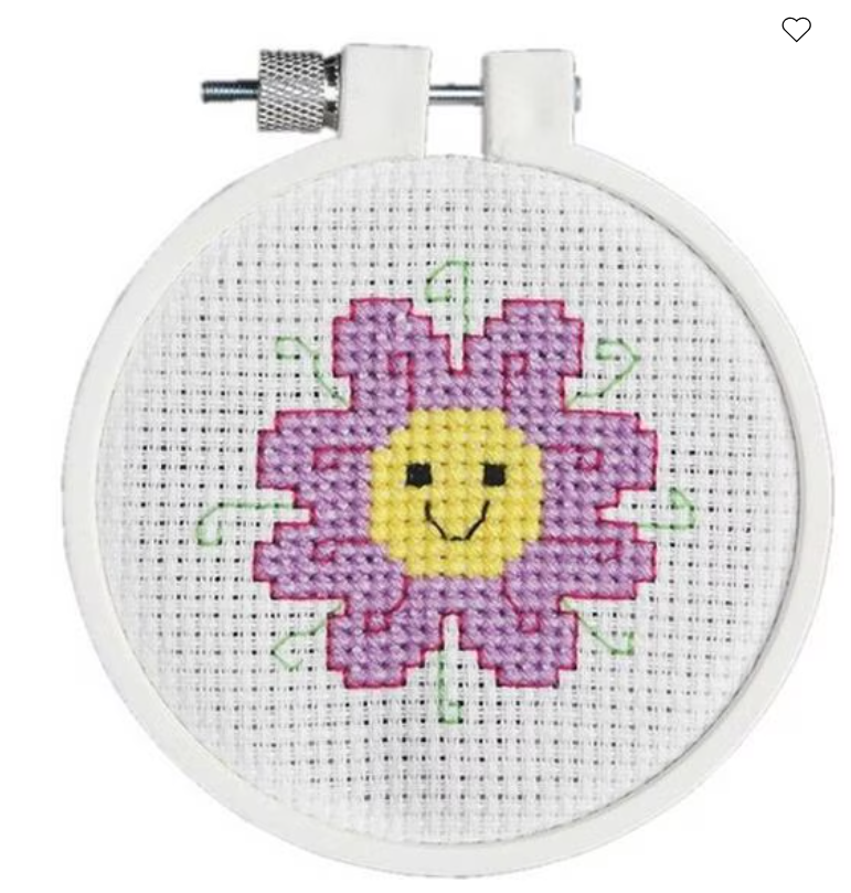 Contains: 11 Count 100% Cotton Aida Fabric, 6-Strand Cotton Aida Fabric, 6-Strand Cotton Floss, Stitching Hoop, Needle, Graph, Instructions. Size 3" Round