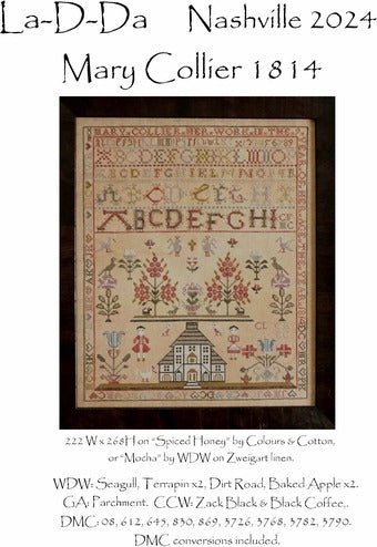 This pattern from La D D features a reproduction sampler with a large white house, flowers, birds and "Mary Collier, her work in the 9th year of her age, the year 1814."