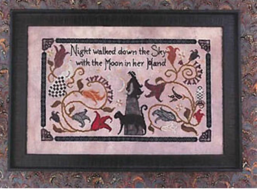 Night walked down the sky with the moon in her hand" Model stitched over two on 40 Ct. Stitch count: 256W x 151H. Design size: 13" x 8" ***PLEASE note: the pattern calls for Gentle Art Sampler thread Seaweed, which was a limited edition color, and is no longer available.