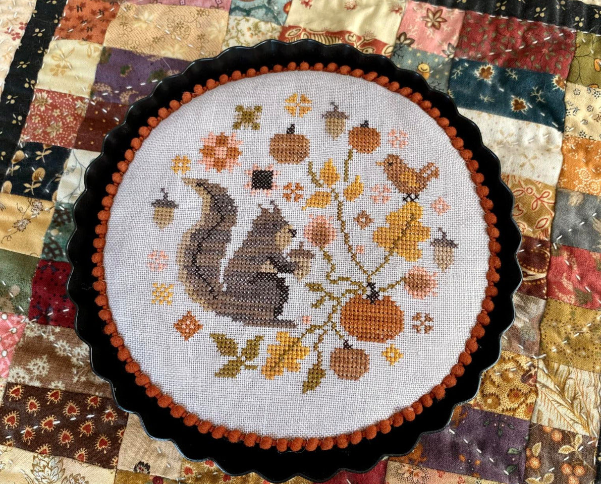Pattern is stitched on 36 count fabric using a variety of thread threads. Trimmed with Lady Dot Creates pom pom in Russet.