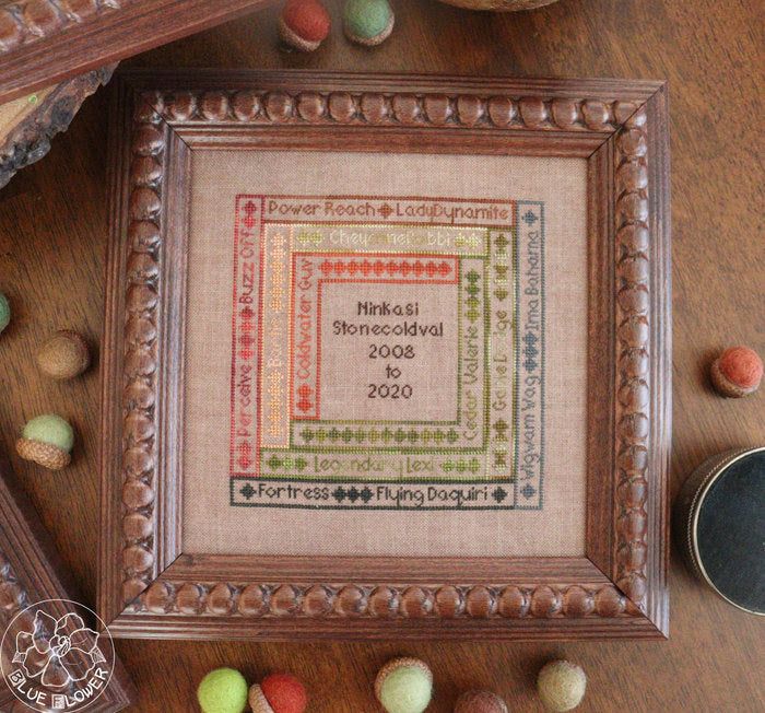 This collection rose out of a challenge - to create an updated family tree design. And so I have one traditional "tree", as well as a design inspired by a log cabin quilt. (This could easily be a biscornu top, and could include a sibling group, names of stitching friends etc.) Finally, there is the "Of Many Lives" piece designed to highlight the interconnectedness of the natural world. (For this, I've included not only the bear option shown in the model, but also options for a beaver, cat, bear or dog, along with some information about what the various choices symbolise.)