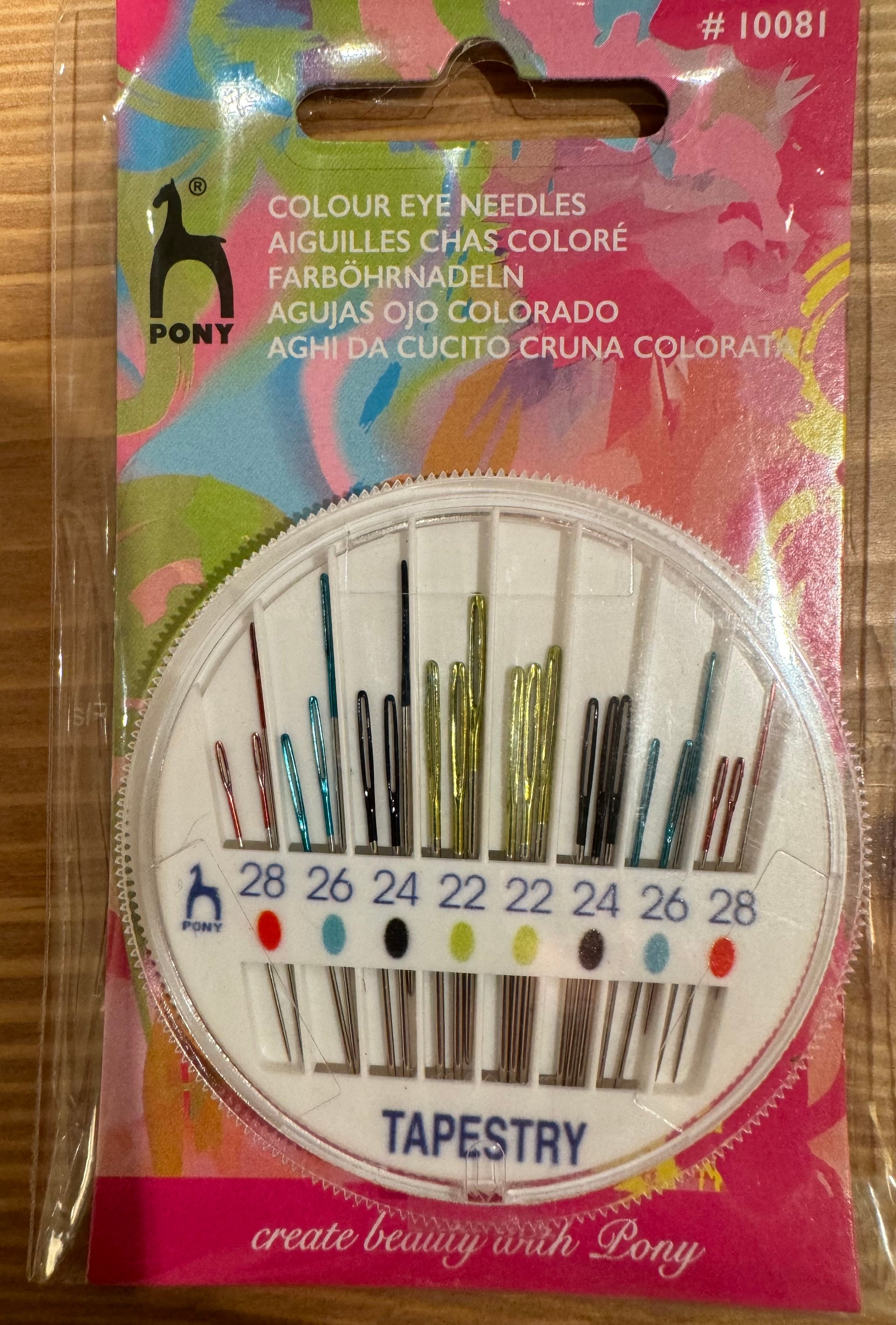 Tapestry needles with eyes color-coded by size. Never guess which needle you’re reaching for!