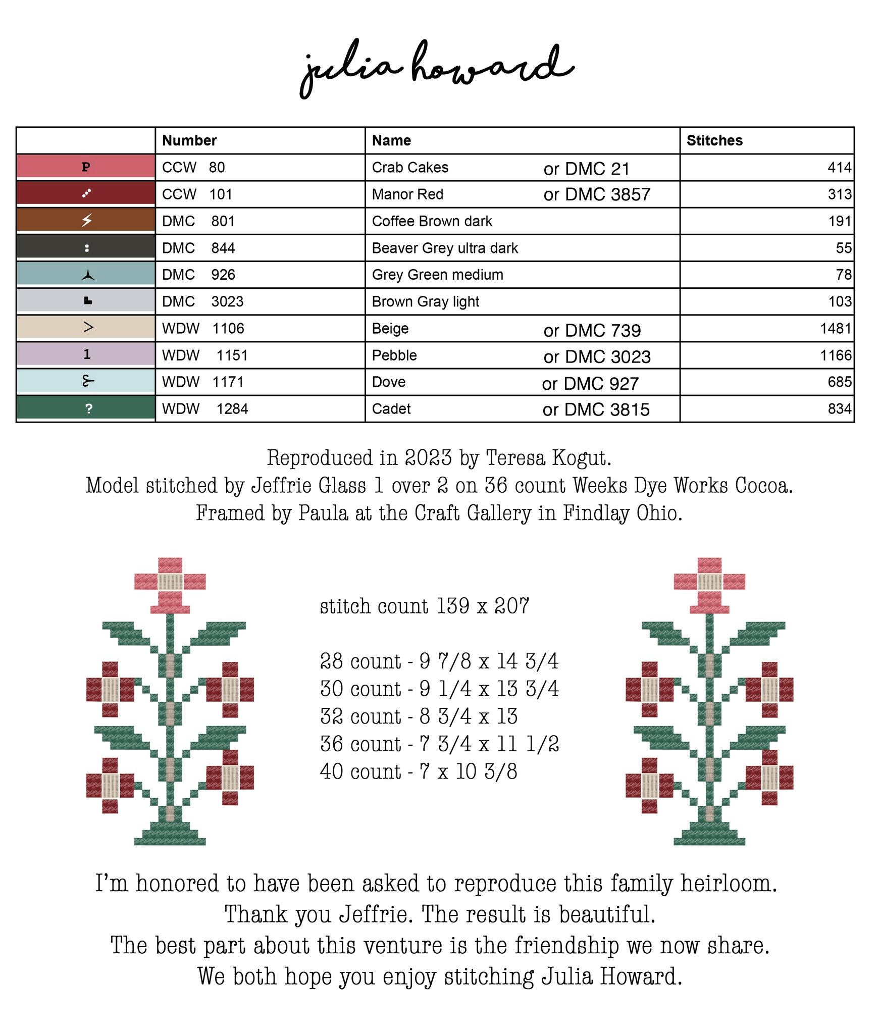 We are excited to bring you Teresa Kogut's new release: Julia Howard, an antique reproduction sampler!