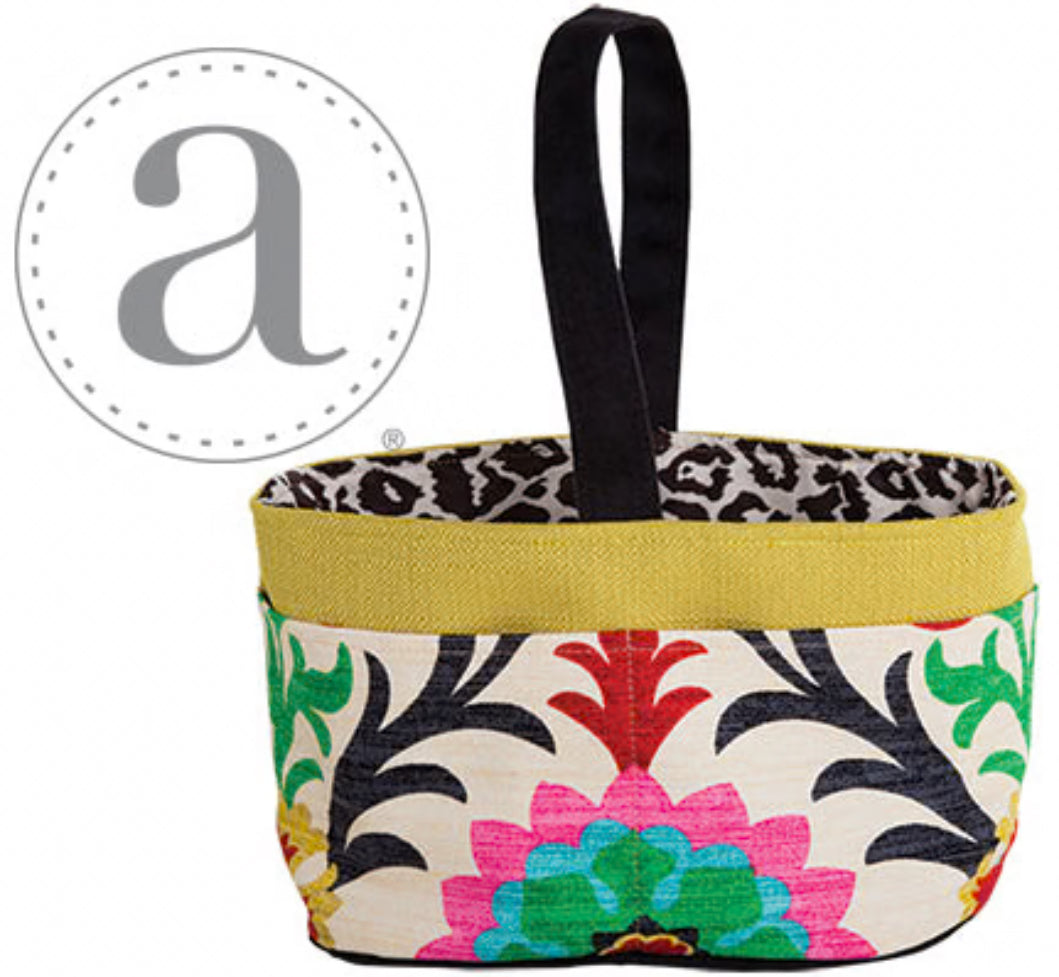 A heavy cotton linen in a colorful Suzani patterned print. The Santa Maria Caddy is a stand-alone, carry around organizer is perfect to store and keep handy all your tools and notions. It’s fully lined and has four outside and four inside pockets with an ample center well and an ultra suede handle.