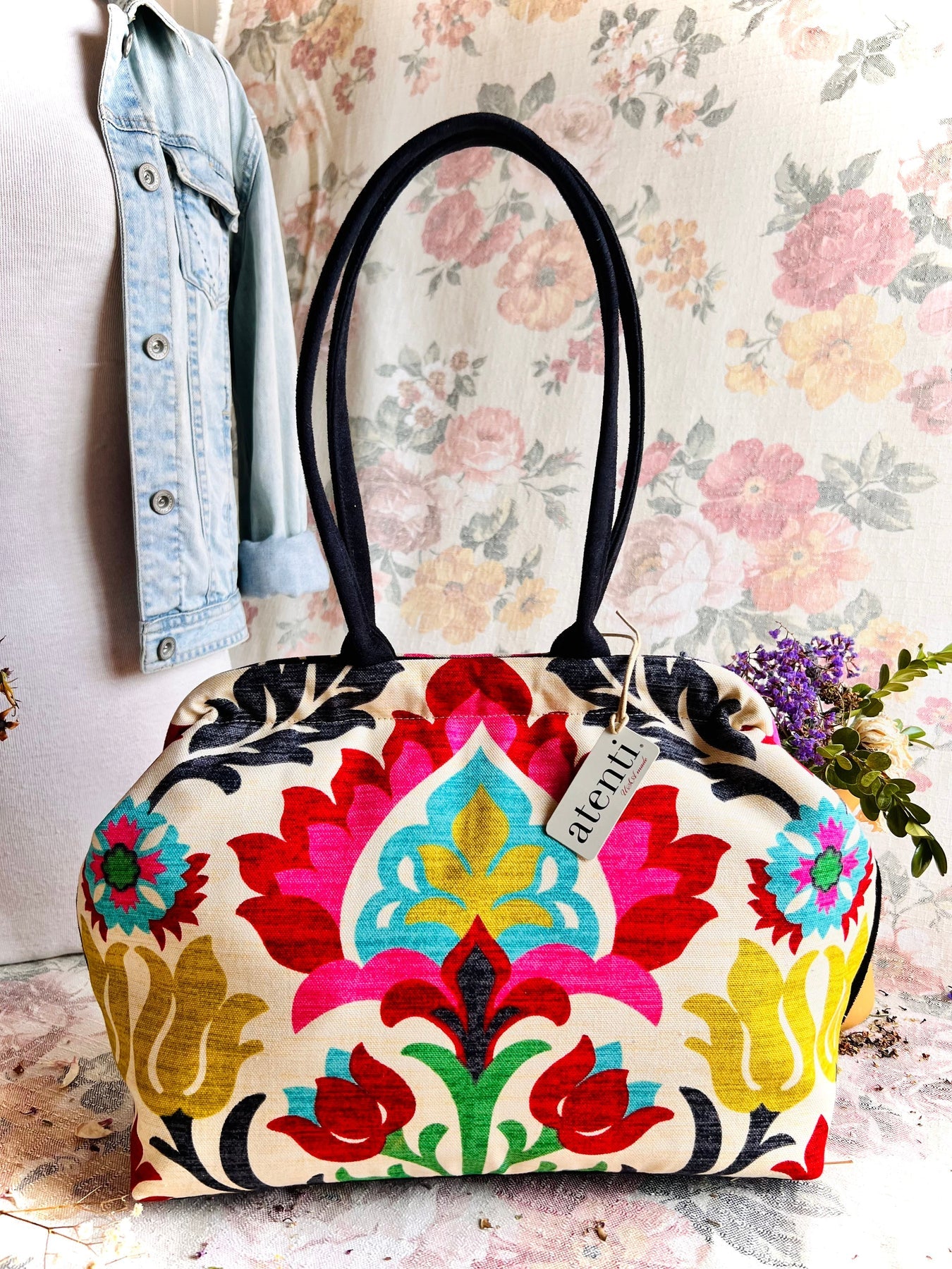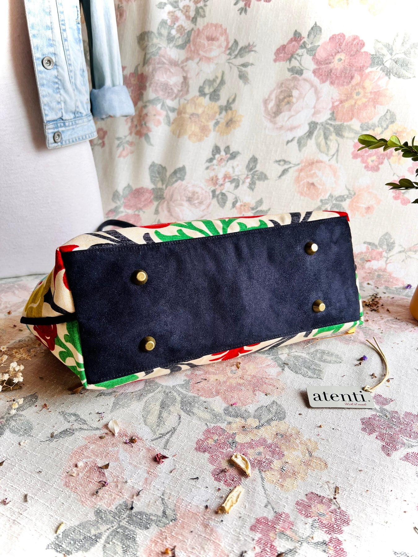 An elegant framed desert floral design with strong Spanish influence. A heavy cotton linen in a colorful Suzani patterned print- same design but different color way from our Santa Monica. The bright colors are artfully showcased against a sandy background. Opening with a 12" rectangular snap frame, the Atenti Molly carpet bag shows off a fully lined water resistant taffeta interior. Inside are a zippered pocket and an open divided pocket with a cell phone slot. The Molly has double 22” straps with a 11’ drop and metal feet. It's a fashionable accessory that's as functional as it is stylish. You'll love toting this bag around town. After all, style matters - and so does keeping your things organized!