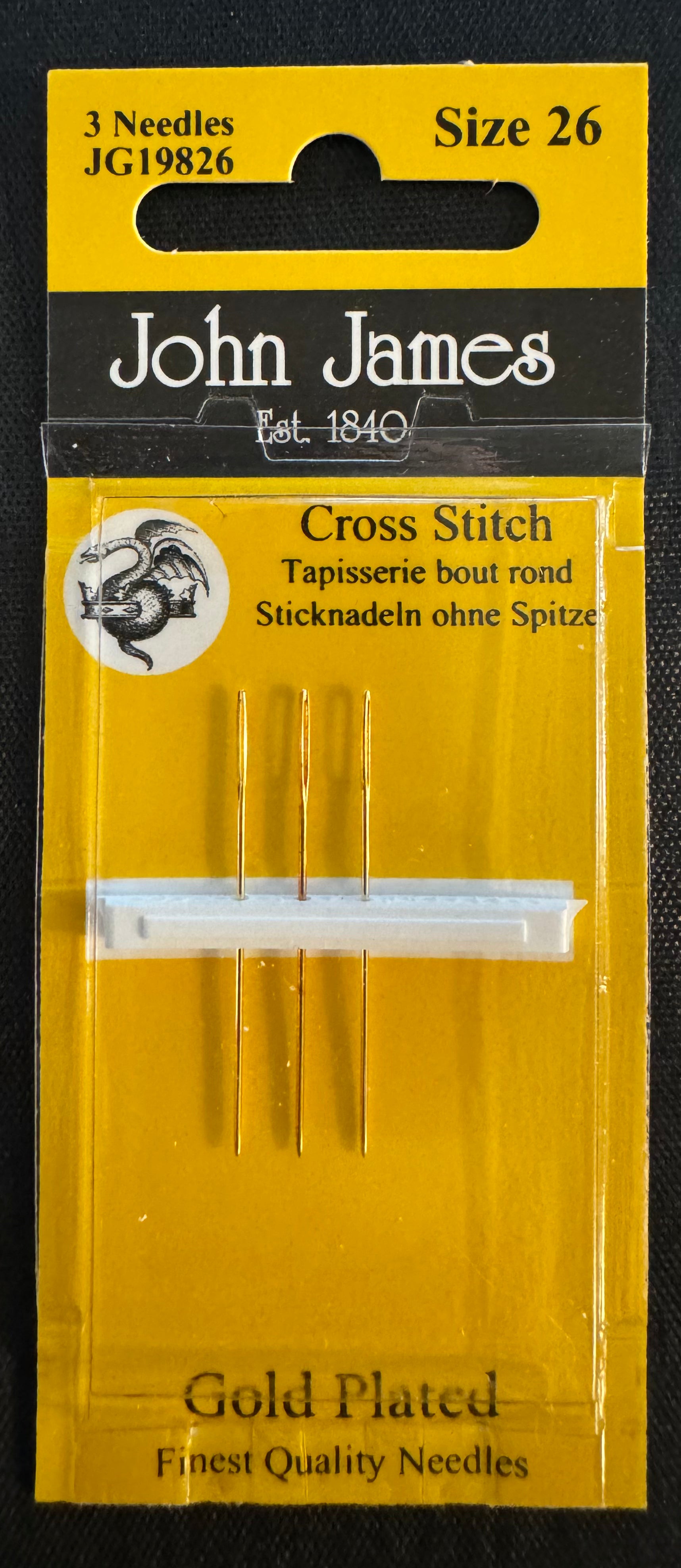Size 26 Gold John James Tapestry Needles. Gold plated needles from John James. Three needles per card.