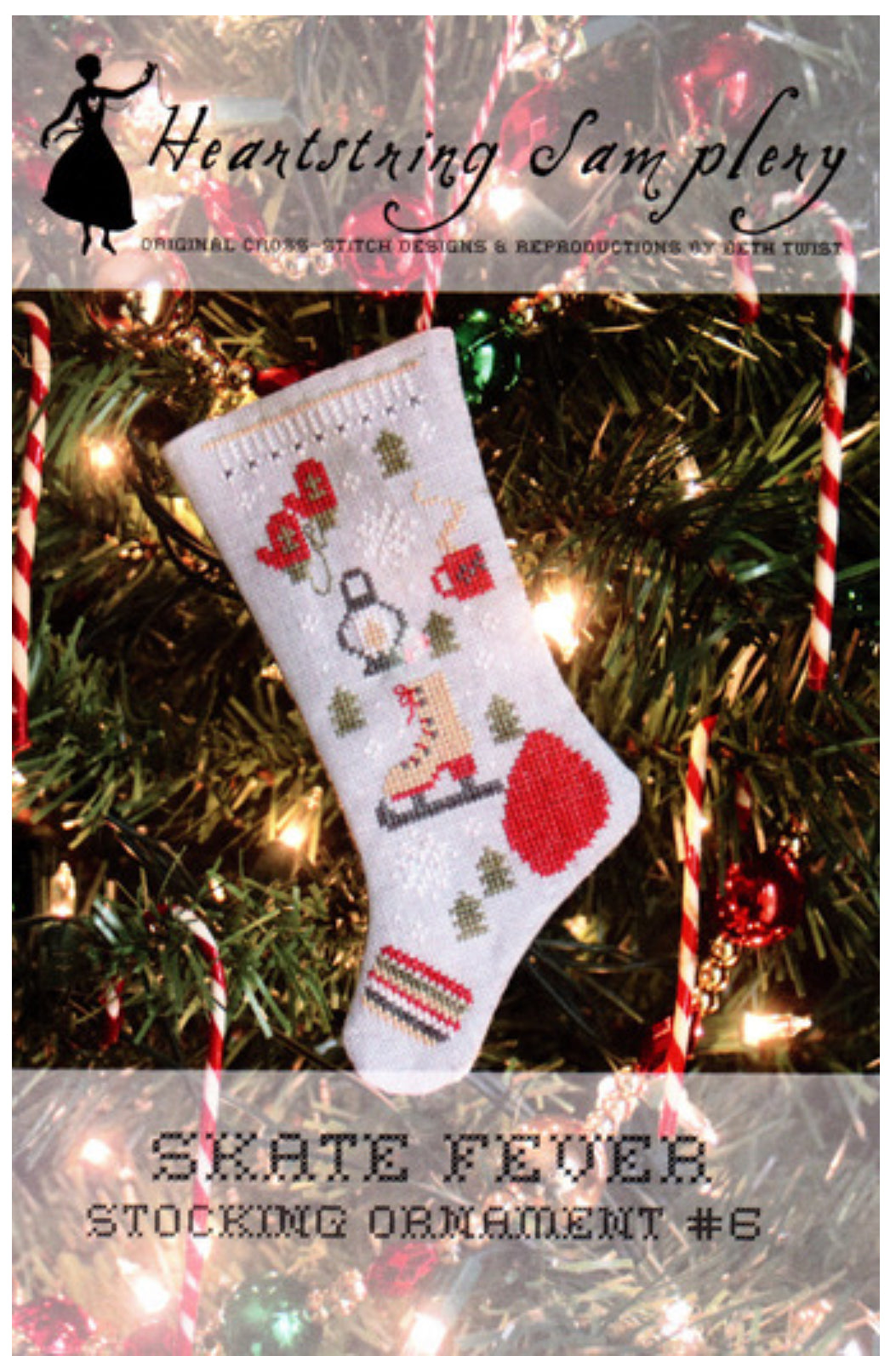 Cross stitch pattern from Heartstring Samplery featuring a Christmas stocking with ice skates!