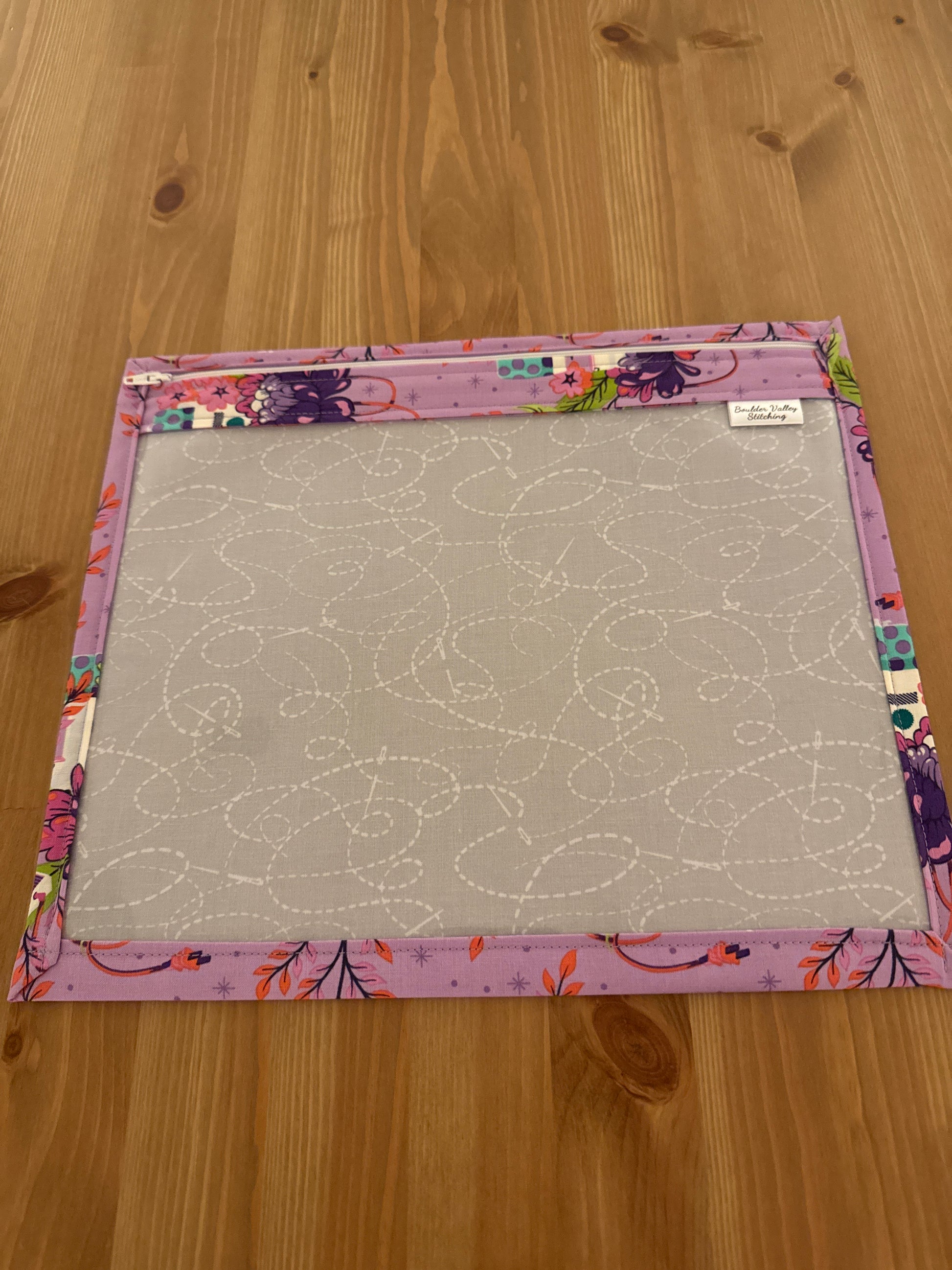 A fun and pretty vinyl front bag for your project! These handmade vinyl front project bags are a perfect size to hold your project and other stitching supplies.