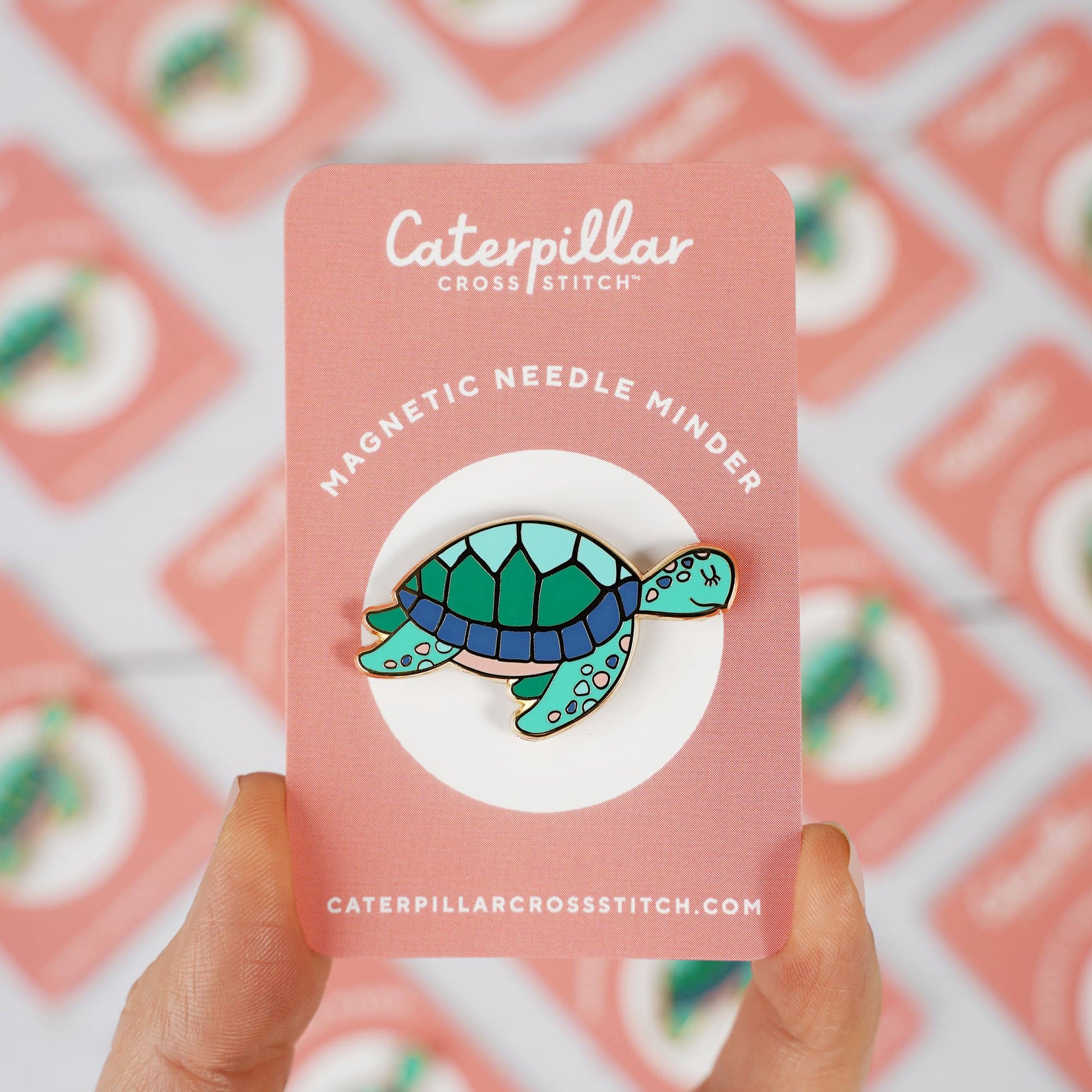 This gorgeous turtle needle minder attaches to the front of your fabric with one magnet and the other magnet secures behind your fabric. Your needle is then held safely on the top enamel piece.