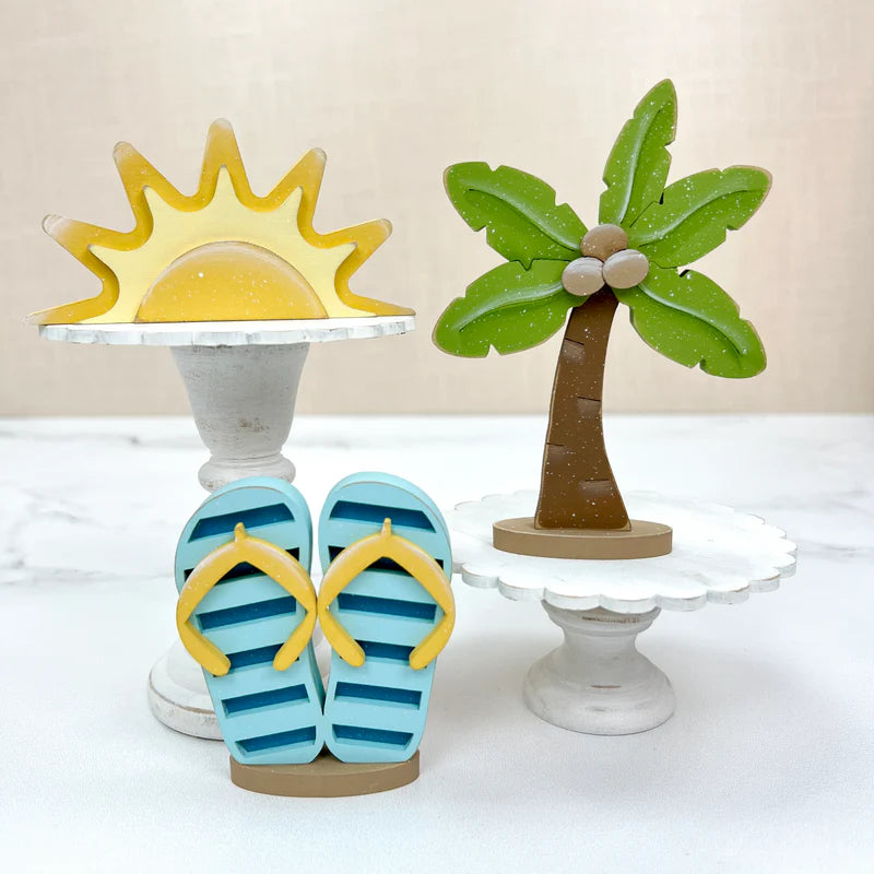 - Size: palm tree 3.25 inches wide by 4.5 inches tall, flip flops 2.5 inches wide by 3 inches wide, sun 4 inches wide by 2 inches tall.